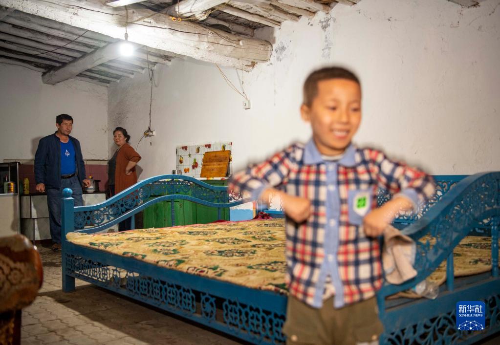 夜间,伊力·买买提和妻子在商量第二天的农活,小儿子萨吾尔登在一旁玩耍(4月16日摄)。