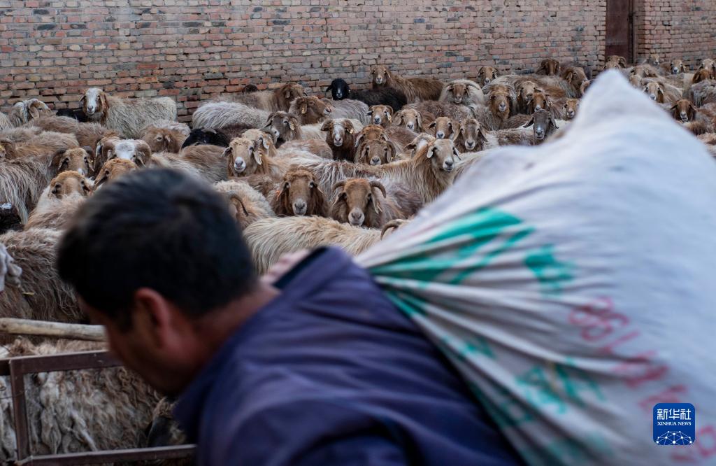 伊力·买买提背着饲料走进养羊的棚圈(4月17日摄)。