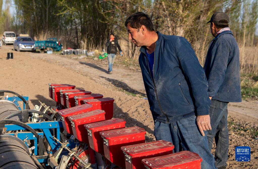农机停靠在棉田,工人们在休息,伊力·买买提好奇地探身观察这台先进的农机设备(4月16日摄)。