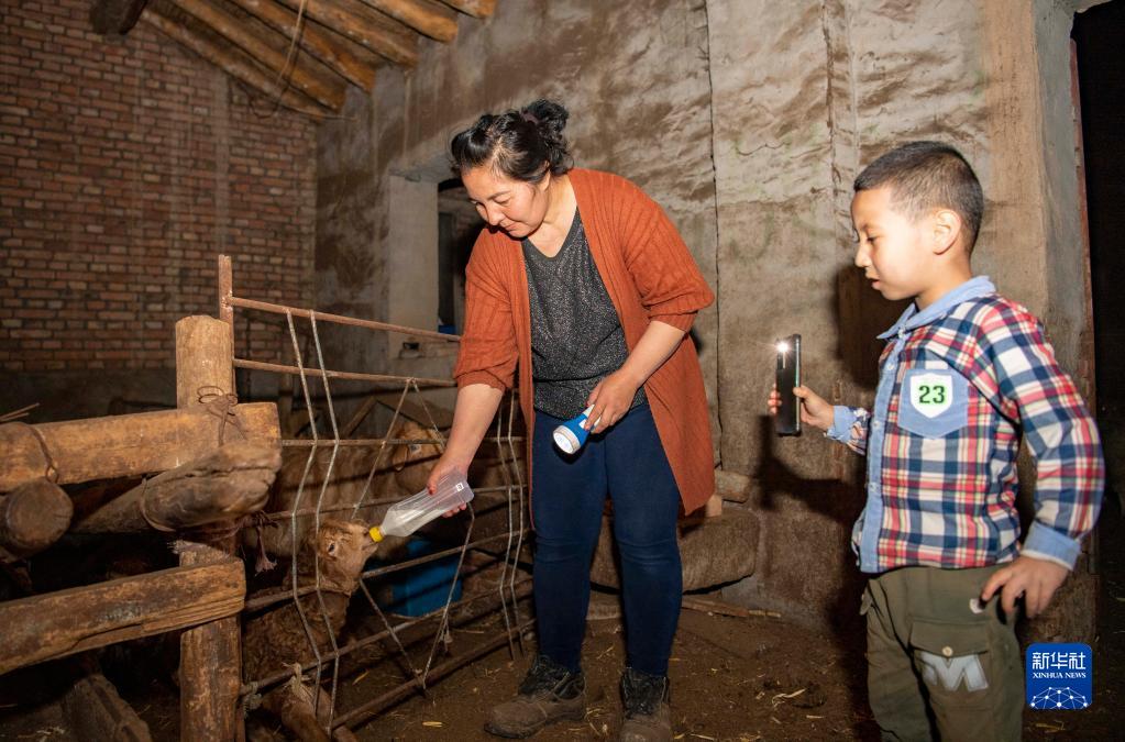 夜间,伊力·买买提的妻子赫妮排姆·库尔班(左)带着小儿子到棚圈里给小羊羔喂食(4月16日摄)。