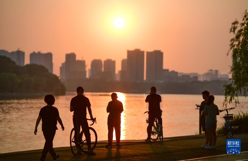 市民在沈阳市浑河岸边驻足欣赏夕阳(2021年6月24日摄)。
