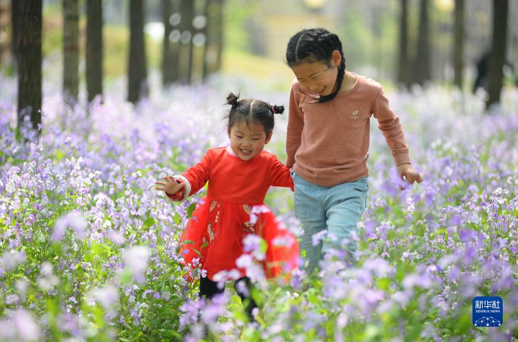 4月5日,小朋友在山东省滕州市上善公园玩耍。