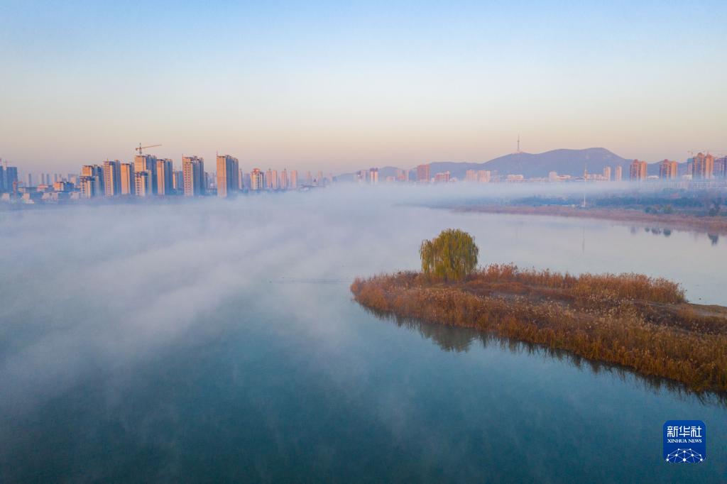 在安徽省淮北市东湖湿地公园,平流雾中的城区若隐若现(2021年12月10日摄,无人机照片)。东湖国家湿地公园曾是煤矿开采过程中形成的塌陷区,如今变身城市绿色空间。