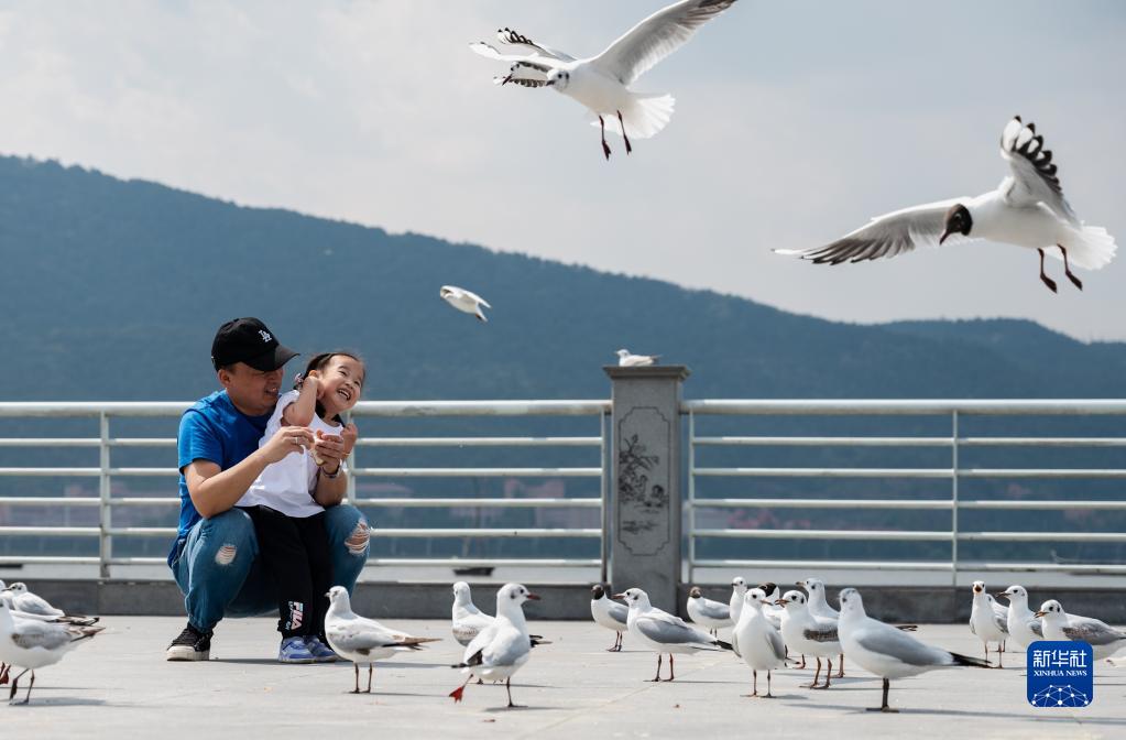 3月16日,游人在昆明海埂大坝观赏红嘴鸥。