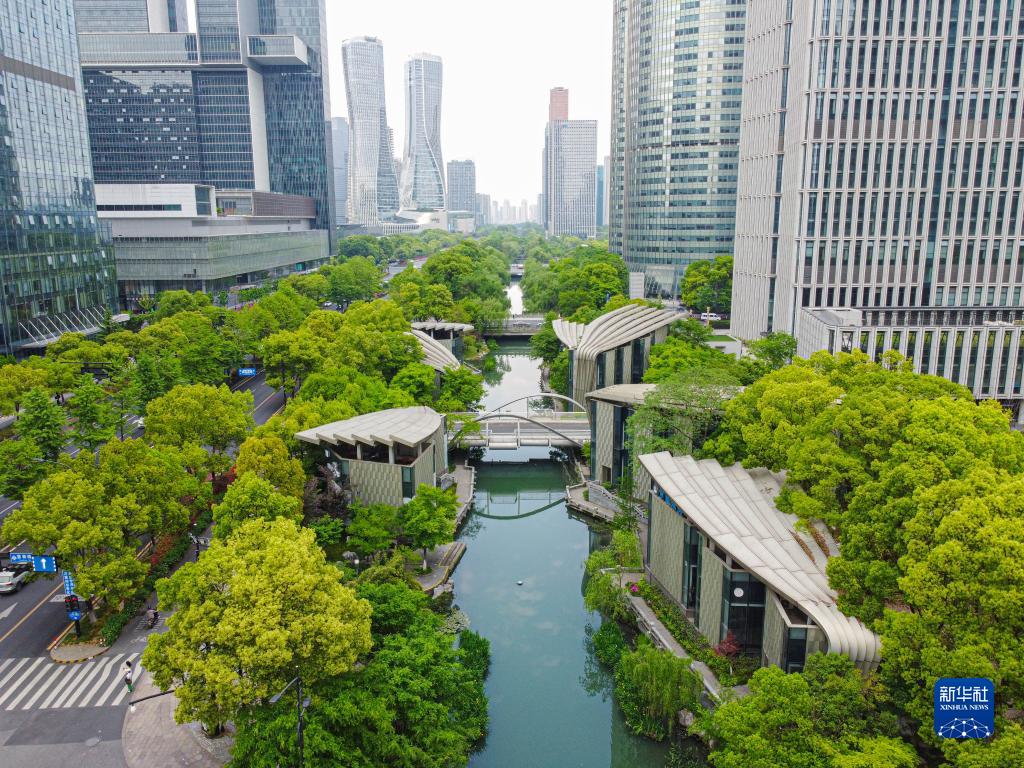 这是4月20日拍摄的杭州钱江新城新塘河(无人机照片)。