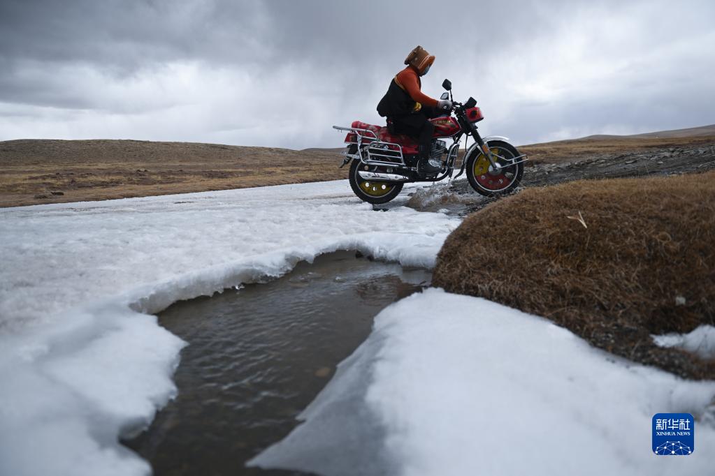 4月21日,在青海省玉树藏族自治州曲麻莱县麻多乡约古宗列曲附近,生态管护员才仁扎西驾驶摩托车巡护。