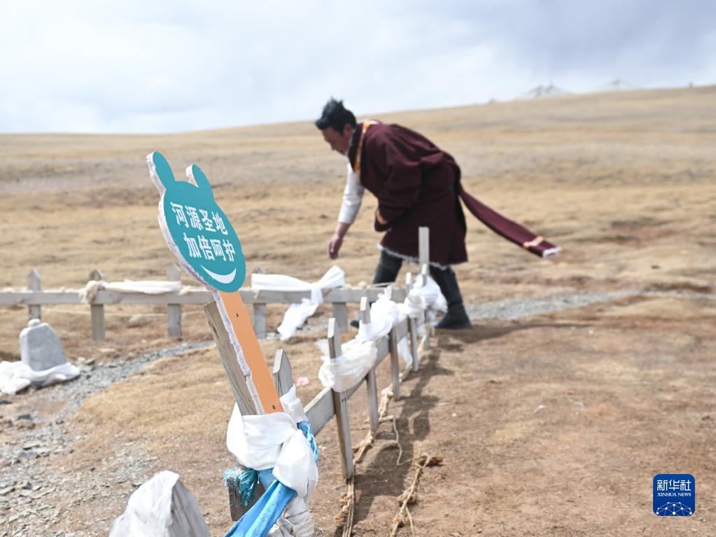4月21日,在青海省玉树藏族自治州曲麻莱县麻多乡约古宗列曲附近,生态管护员格桑东周在整理黄河源头的栅栏。