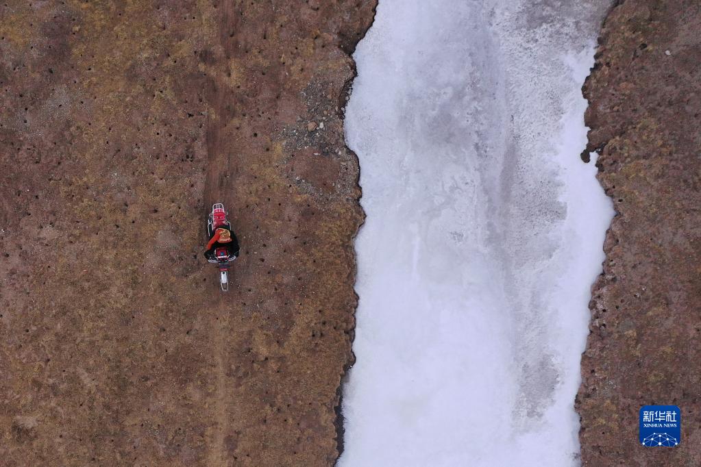 4月21日,在青海省玉树藏族自治州曲麻莱县麻多乡约古宗列曲附近,生态管护员在巡护(无人机照片)。