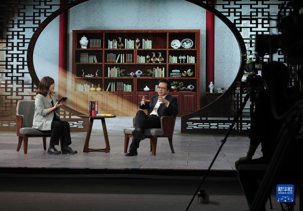 陈彦(右)在新华社全媒体栏目“大家悦读课”录制现场接受新华社记者专访(3月30日摄)。