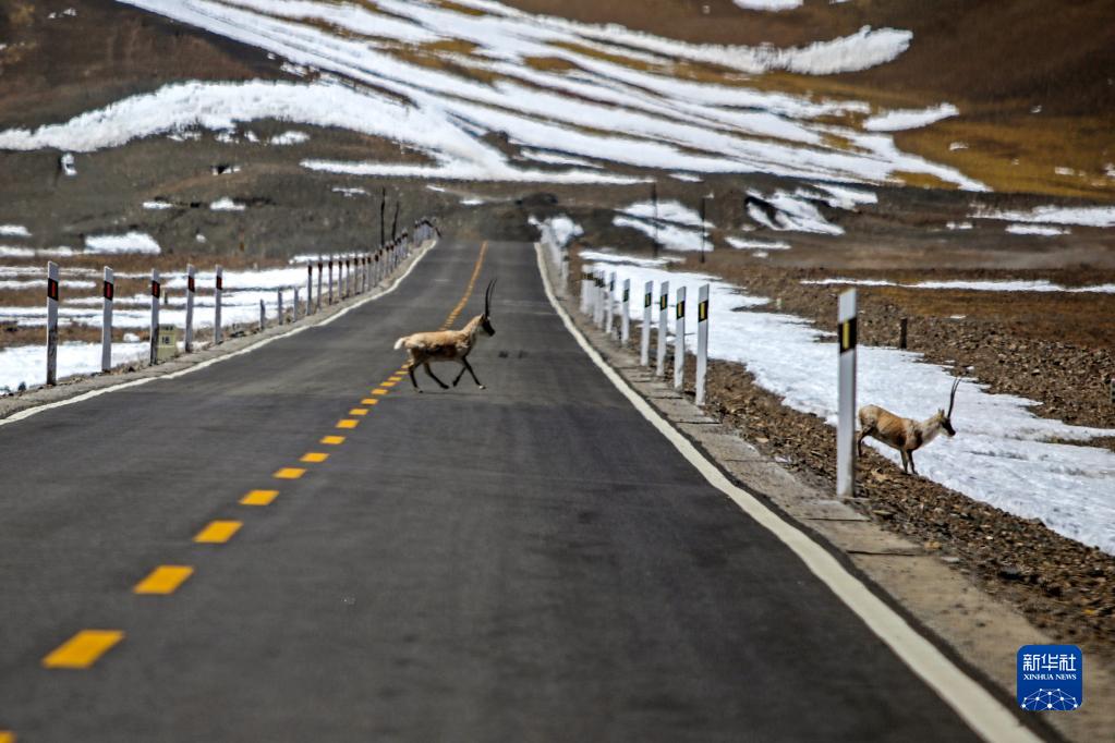两头藏羚羊在阿里地区日土县横穿公路(4月9日摄)。