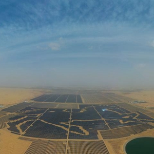 一匹占地130多万平方米的沙漠“骏马”横卧在内蒙古自治区库布其沙漠之中,这是位于达拉特光伏发电应用领跑基地中、由近20万块光伏板组成的“骏马电站”。该电站采用“林光互补”模式,板上发电、板下种植,在开发利用库布其沙漠丰富太阳能资源的同时,推动沙漠生态治理。