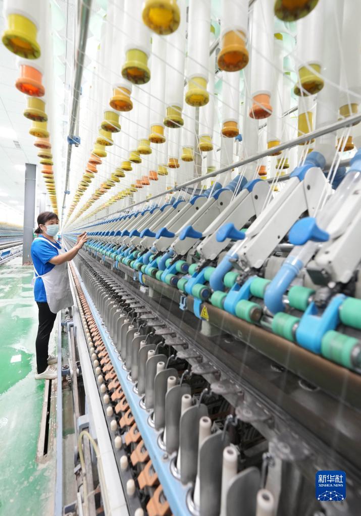 4月22日,工人在晋州市一家纺织企业的纺纱车间工作。