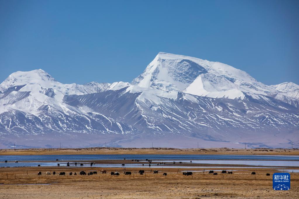 4月22日,牦牛在西藏阿里地区普兰县境内纳木那尼峰山脚下活动。
