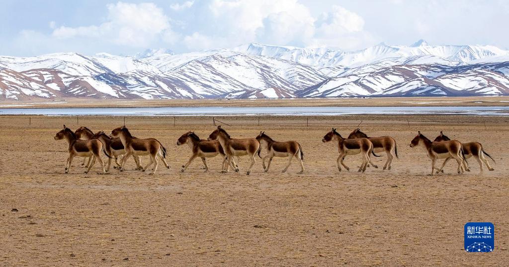 4月22日,藏野驴在西藏阿里地区普兰县境内雪山下活动。