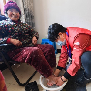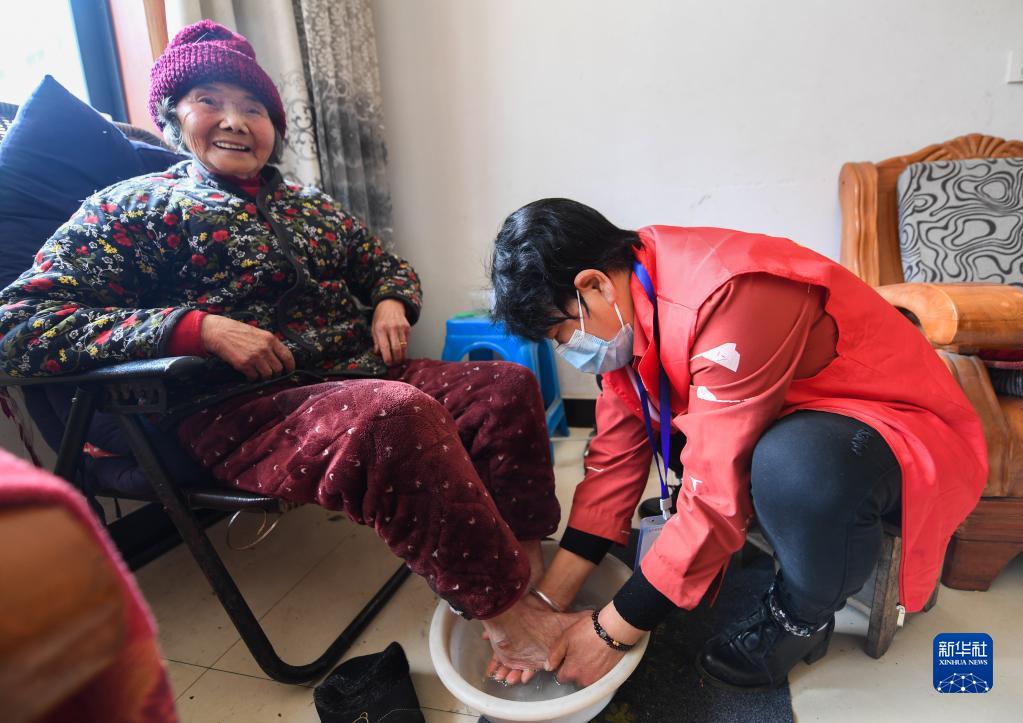 4月22日,在杭州市临安区太阳镇上太阳村,助老员给82岁的何冬书老人(左)提供上门洗脚、剪指甲服务。