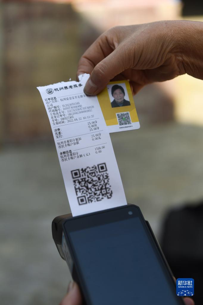 4月22日,在杭州市临安区太阳镇上太阳村,助老员在扣除服务对象电子津贴中的“重阳分”。