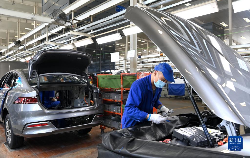 4月20日,工作人员在西安比亚迪草堂工业园汽车总装厂进行新能源汽车装配。