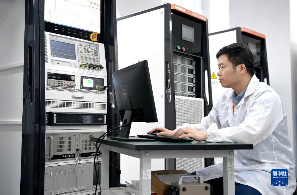 4月21日,西安领充新能源公司智能检测实验室的工作人员进行电动汽车充电兼容性测试。