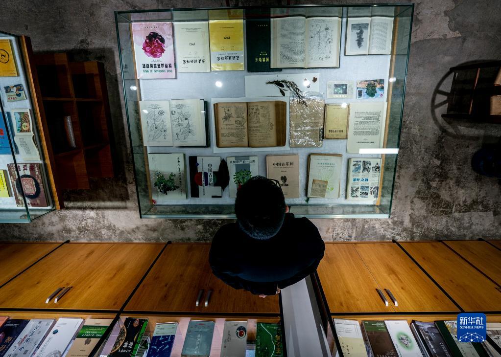 周重林在整理书店里展出的茶书(4月21日摄)。