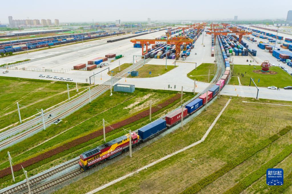 4月22日,陕西西安首趟中老铁路(西安至万象)国际货运列车从西安国际港站发车(无人机照片)。