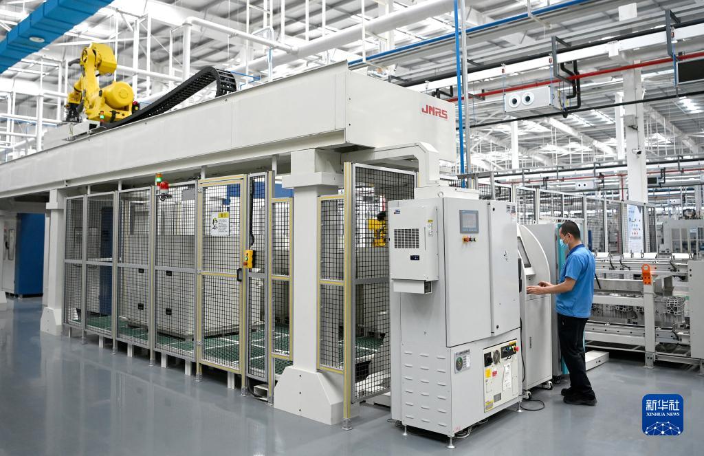 4月21日,工作人员在法士特西安高智新公司变速器零件数字化生产线进行设备调试。