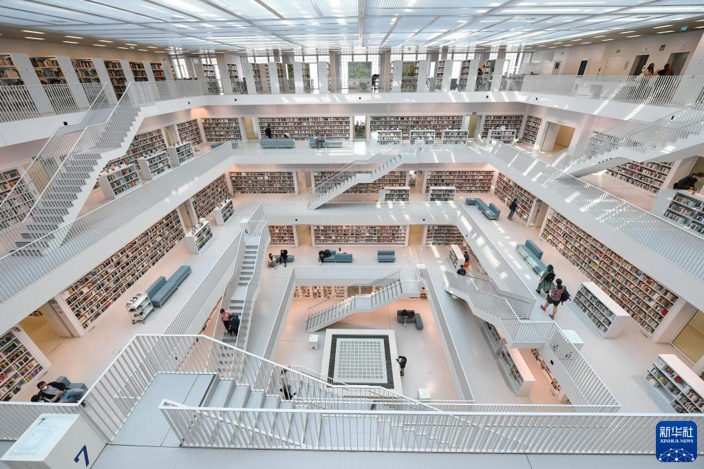 德国斯图加特市立图书馆建筑外观呈立方体,内部采用中空设计,书柜放置在四周,中空部分用错位的楼梯连接,营造出独特的空间感和设计感,自2011年建成后成为当地的文化名片和众多游客的“打卡”地点。