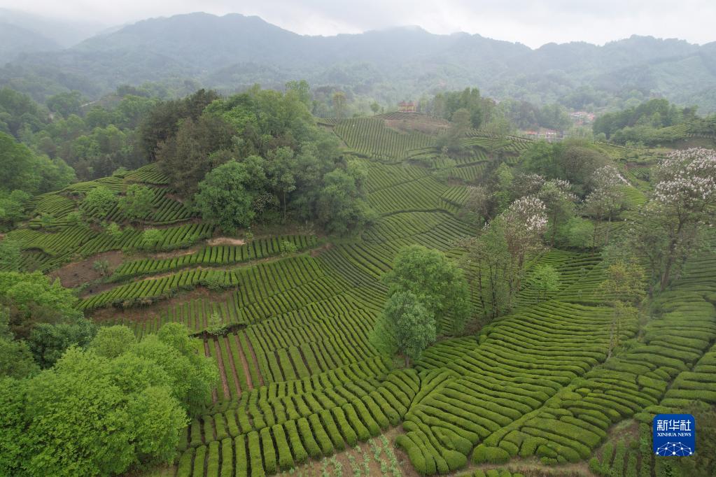 汉中市西乡县峡口镇一处茶园景色(4月15日摄,无人机照片)。