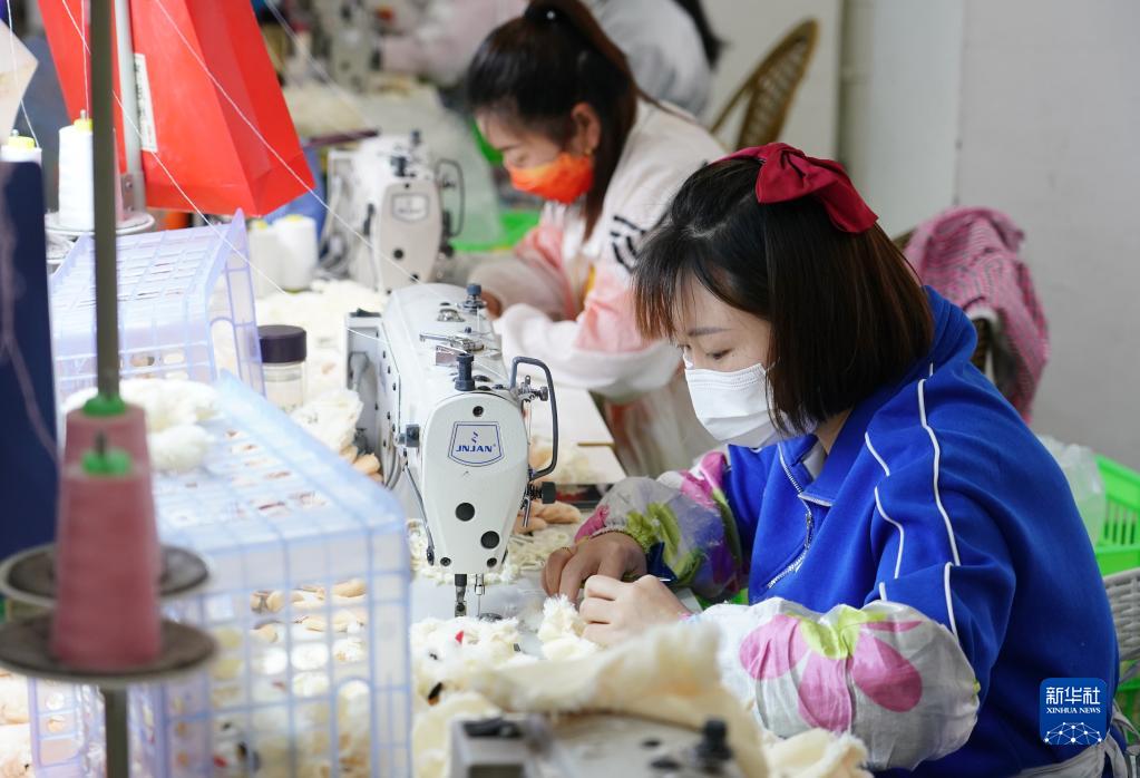 安康市平利县老县镇一家社区工厂的工人在制作毛绒玩具(4月12日摄)。