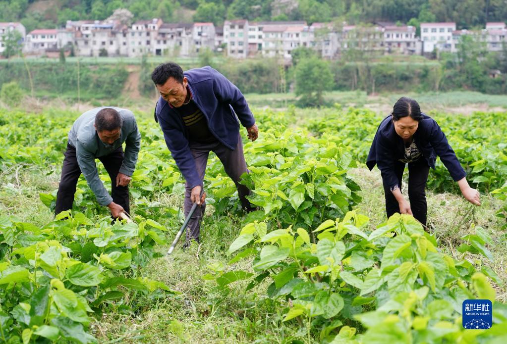 农民在汉中市西乡县子午镇一处蚕桑种植基地内锄草(4月14日摄)。