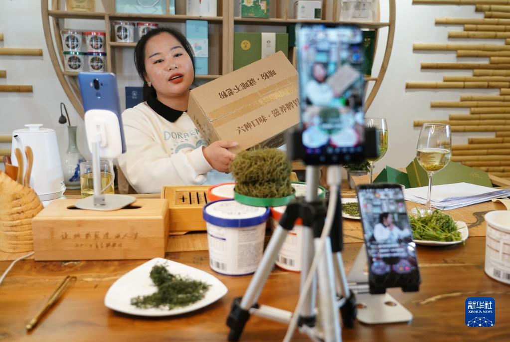 安康市平利县长安镇一家茶企业的工作人员在进行直播销售(4月12日摄)。
