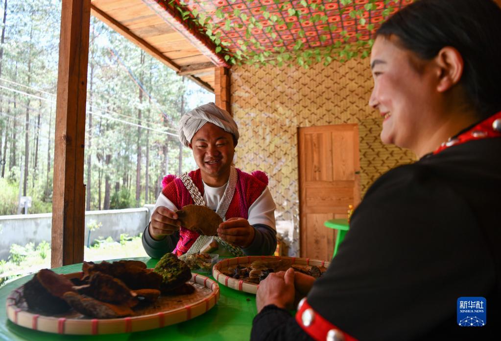 迪龙(左)在附近村民家采购土特产(4月21日摄)。