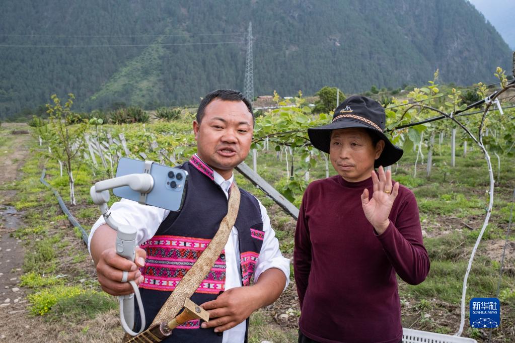 迪龙(左)在村子里的猕猴桃园采访科技特派员(4月19日摄)。