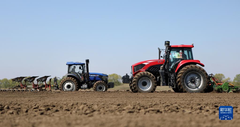 4月22日,在台安县达牛镇十四家子村大豆基地,农机手驾驶农机对农田进行翻耕。