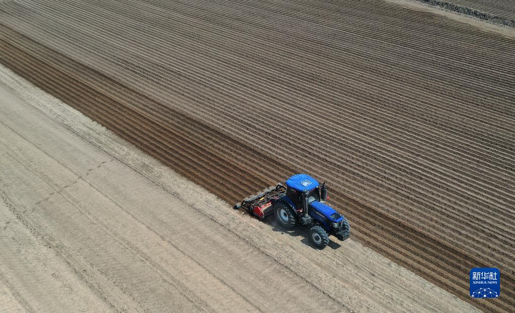 4月22日,在台安县达牛镇十四家子村大豆基地,农机手驾驶农机对农田进行翻耕(无人机照片)。