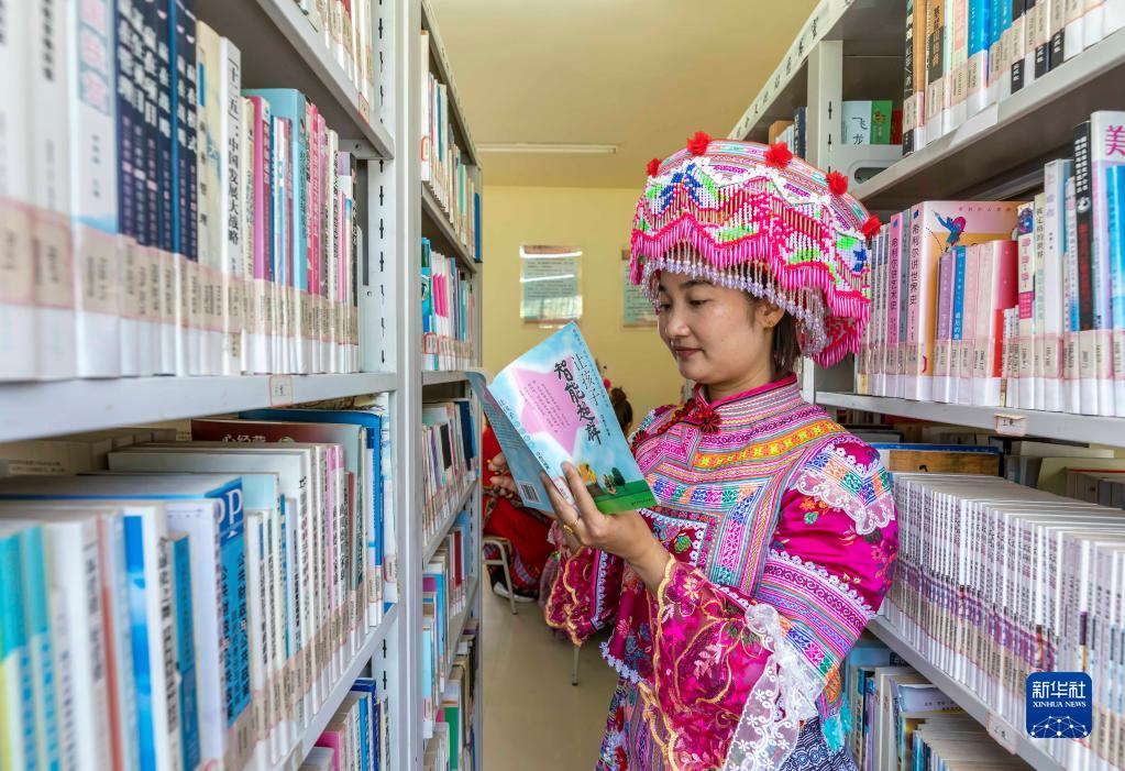4月23日,一名苗族女子在贵州省黔西市红林彝族苗族乡农家书屋阅读图书。