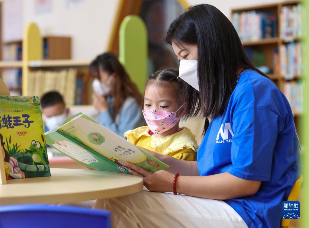 4月23日,家长带着孩子在贵州省铜仁市玉屏侗族自治县图书馆内阅读。