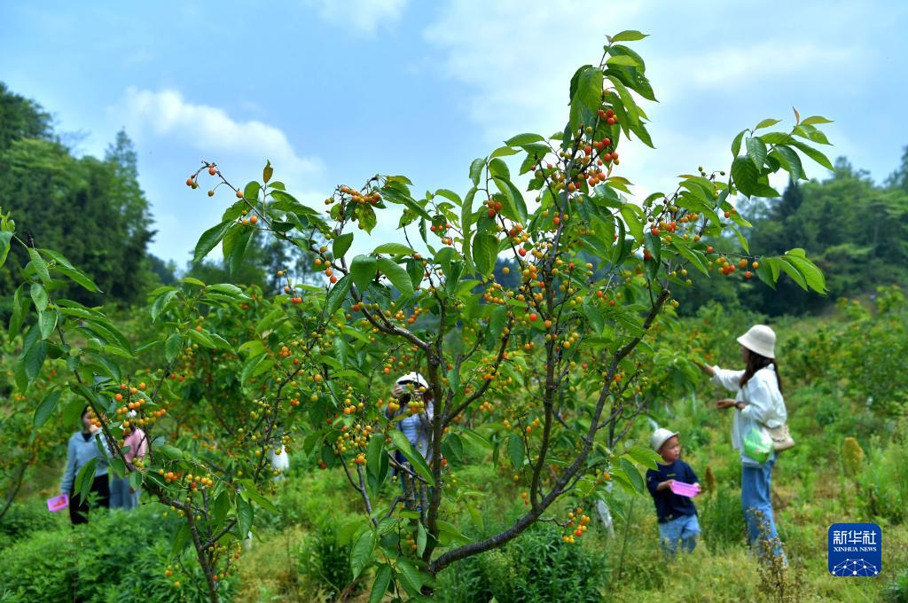 近日,湖北省恩施土家族苗族自治州宣恩县李家河镇金陵寨村引种的樱桃进入成熟期,吸引众多游客前往采摘。
