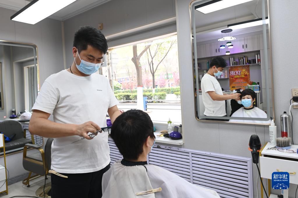4月23日,在西宁市城西区一家理发店,理发师为顾客剪发。