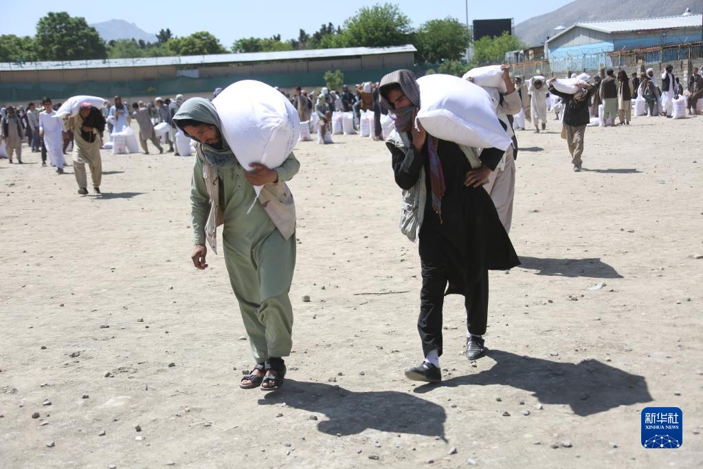 阿富汗临时政府难民事务部23日在首都喀布尔向1500名困难民众分发了中国政府提供的粮食援助。这是于本月初运抵的中国政府对阿富汗人道主义援助的第五批粮食。新华社发(塞夫拉赫曼·萨菲摄)