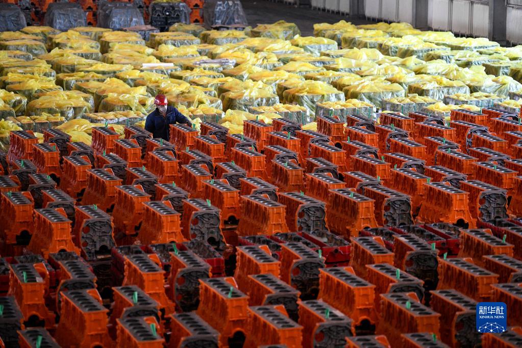 4月24日,工人在位于双滦区的北汽福田汽车股份有限公司车间内检查汽车发动机缸体。