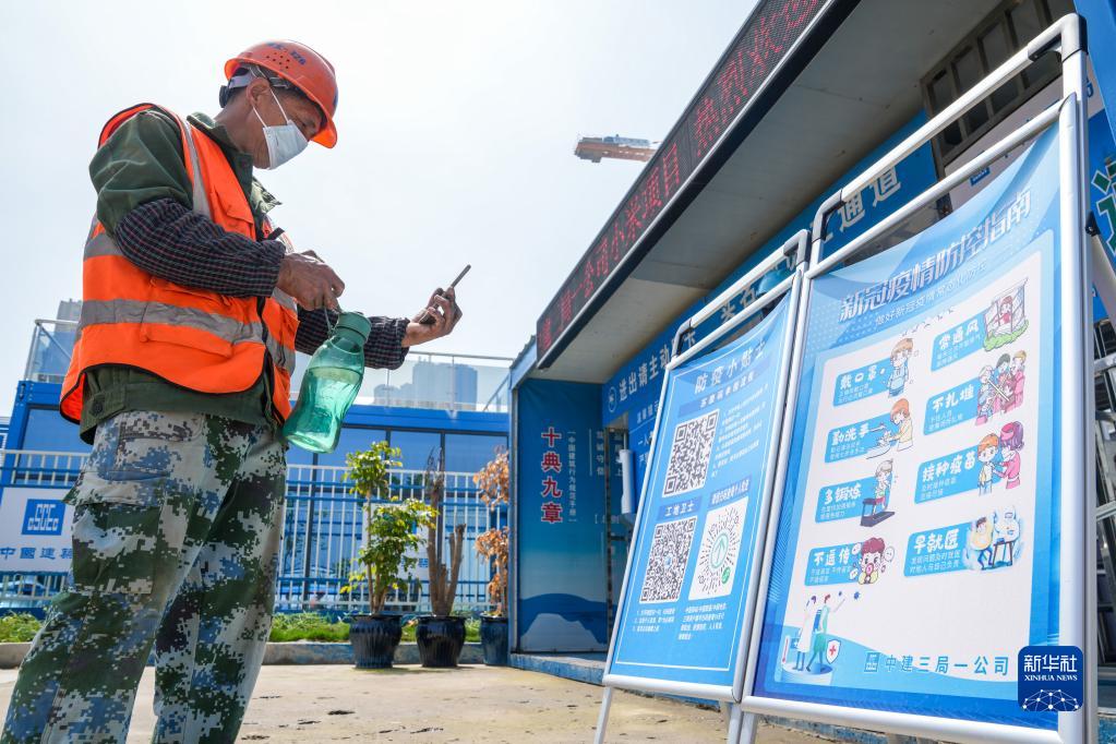 4月24日,中建三局一公司的工程人员在进入施工现场前,用手机扫码登记信息。新华社记者 李博 摄