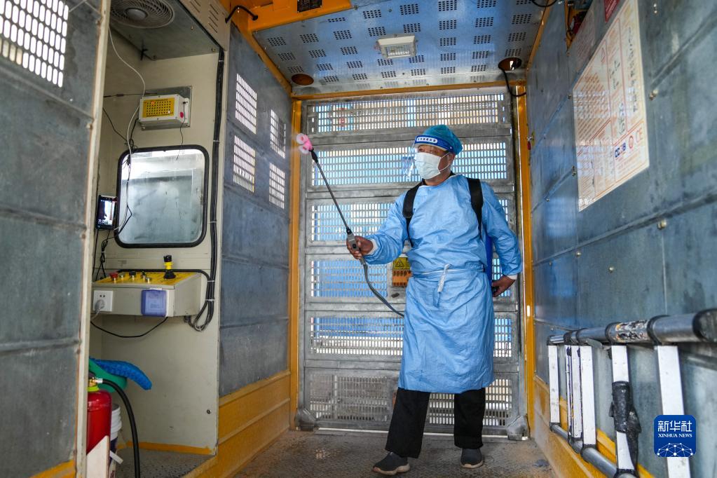 4月24日,中建三局一公司的工作人员在项目施工现场公共区域进行消杀。新华社记者 李博 摄