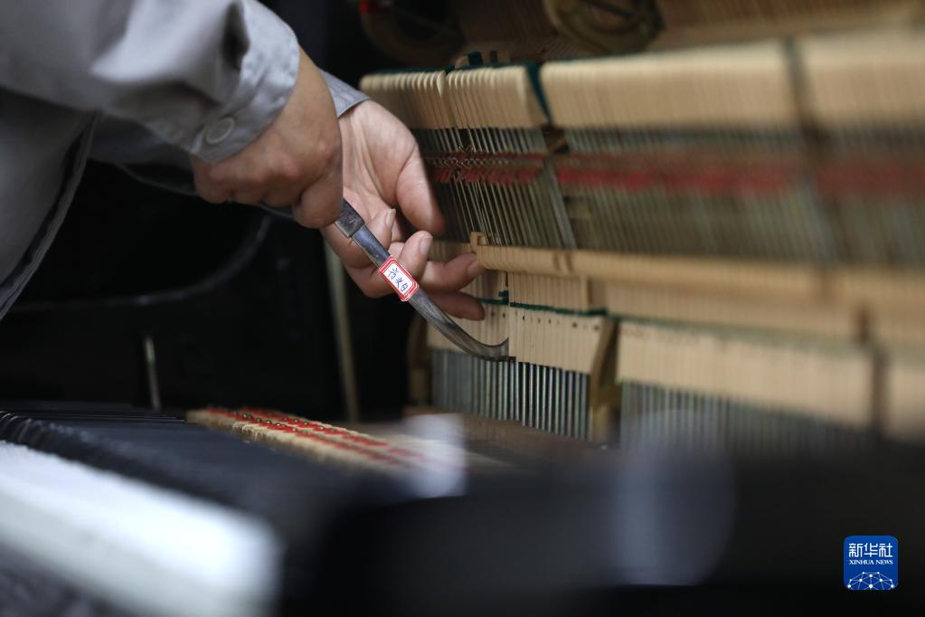 4月25日,一名工人在车间内组装调校钢琴组件。