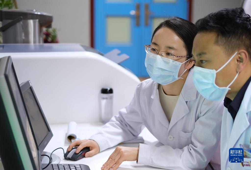 4月25日,青海省人民医院医生、青南支医队员祁永红(左)给青海省玉树藏族自治州人民医院医生普措然丁(右)讲解头颅磁共振成像操作。