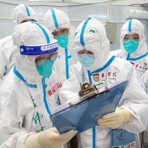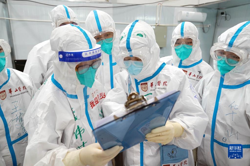 4月25日,上海临港方舱医院的医护人员在交接班时交流老年患者的情况。