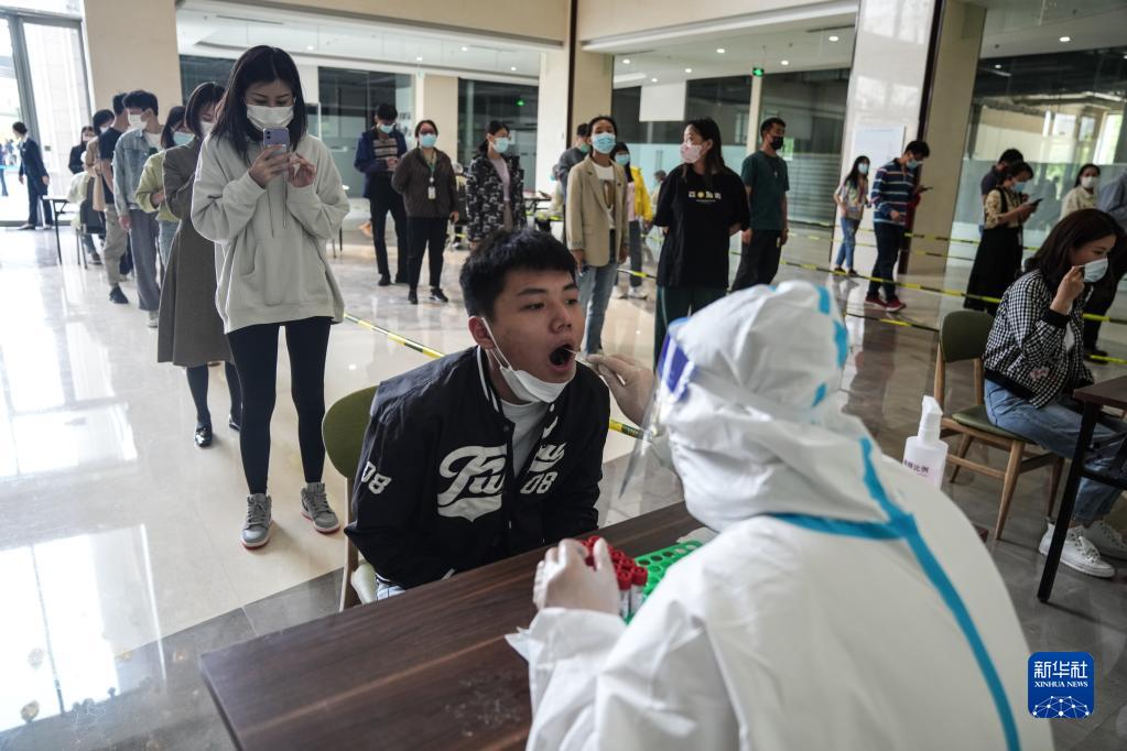 4月26日,在北京经济开发区的一处核酸检测点,居民在进行核酸检测。