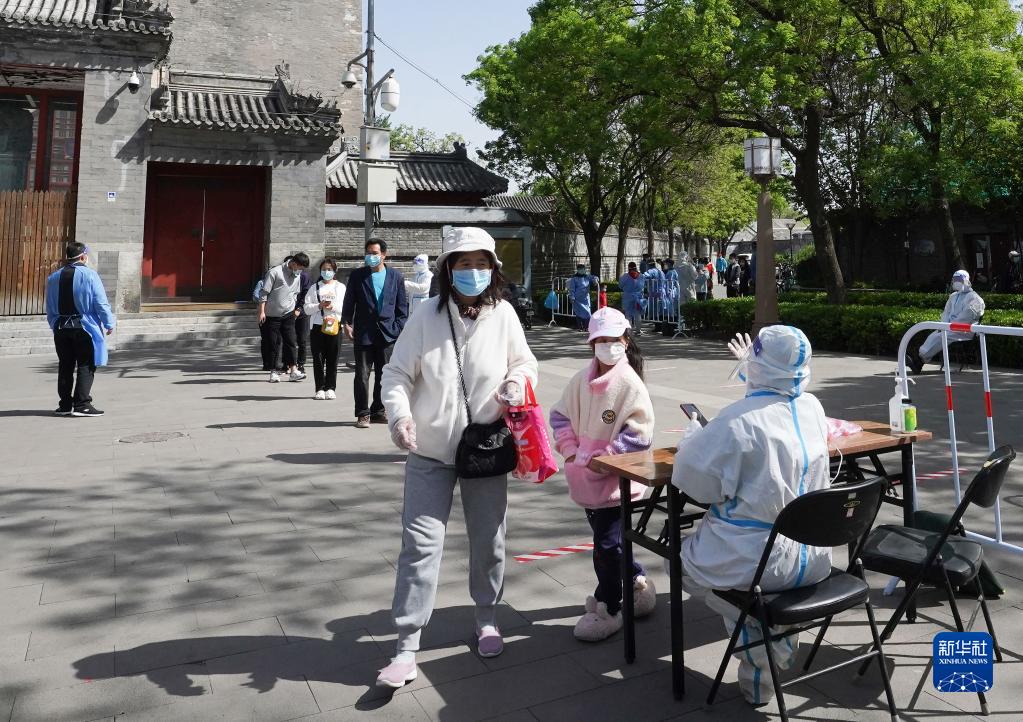 4月26日,在北京市东城区安定门街道钟鼓楼文化广场核酸采样点,市民在排队登记信息进行核酸采样。