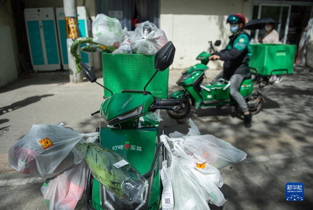 4月26日,在北京市朝阳区十里堡的叮咚买菜前置仓配送站外,一辆电动车上挂满了待送货物。