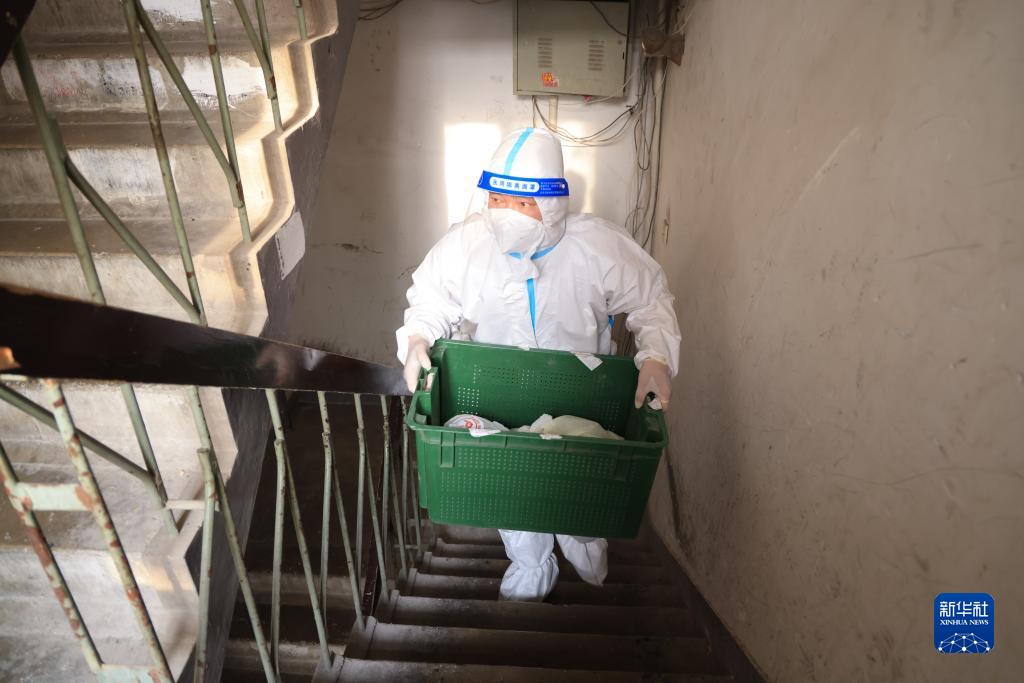 4月24日,朝阳区劲松街道社区工作者为封控区居民上门送物资。