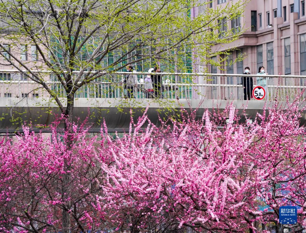 4月26日,行人在哈尔滨市一过街天桥上驻足。
